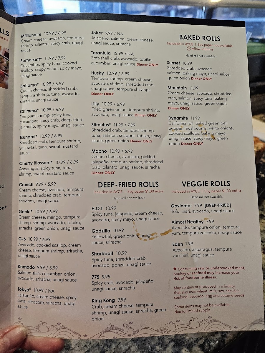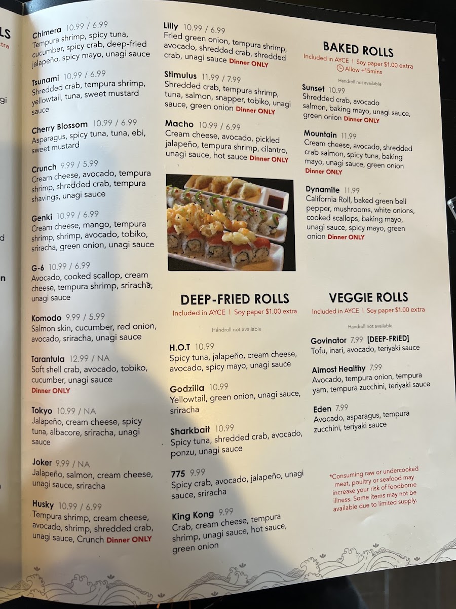 Cream cheese, avocado, shredded crab, salmon, spicy tuna, baking mayo, unagi sauce, spicy mayo, green onion
